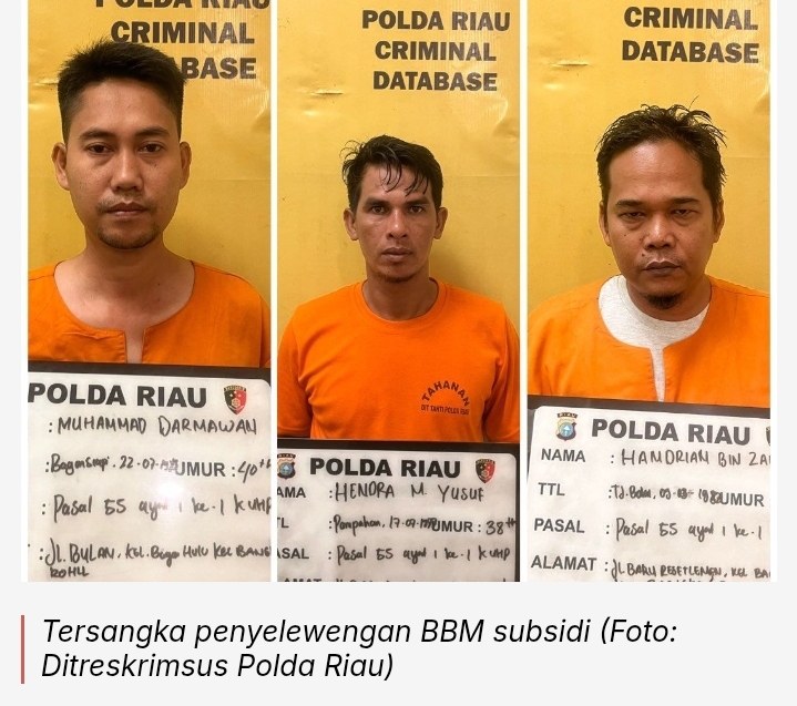 Direktur Reskrimsus Polda Riau Kombes Ade Kuncoro Ridwan, mengatakan dari penangkapan ini diamankan tiga orang pria yang memiliki peranan berbeda. Diantaranya Hendra M. Yusuf (38) sebagai pelangsir atau pengumpul dan penyalur BBM bersubsidi.
